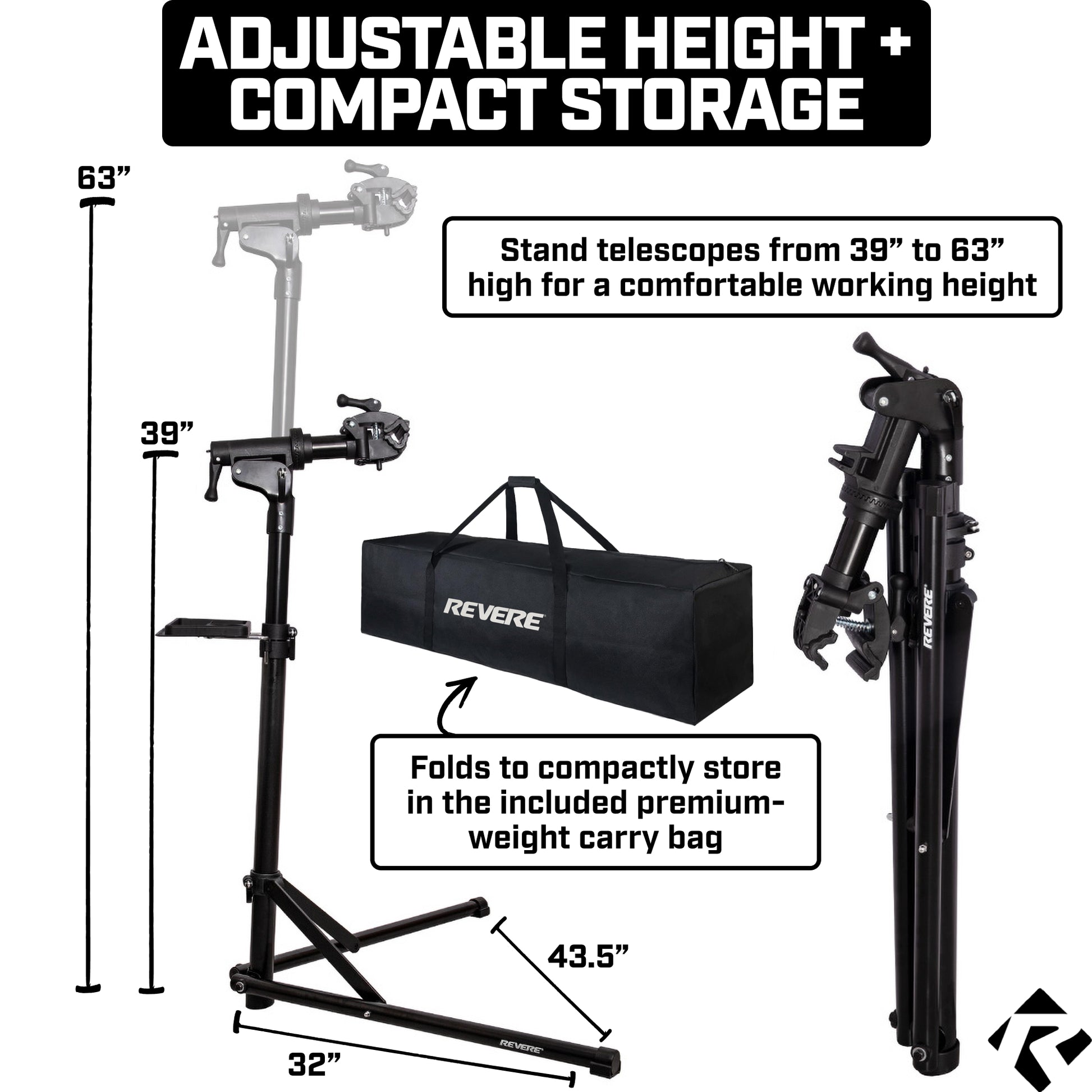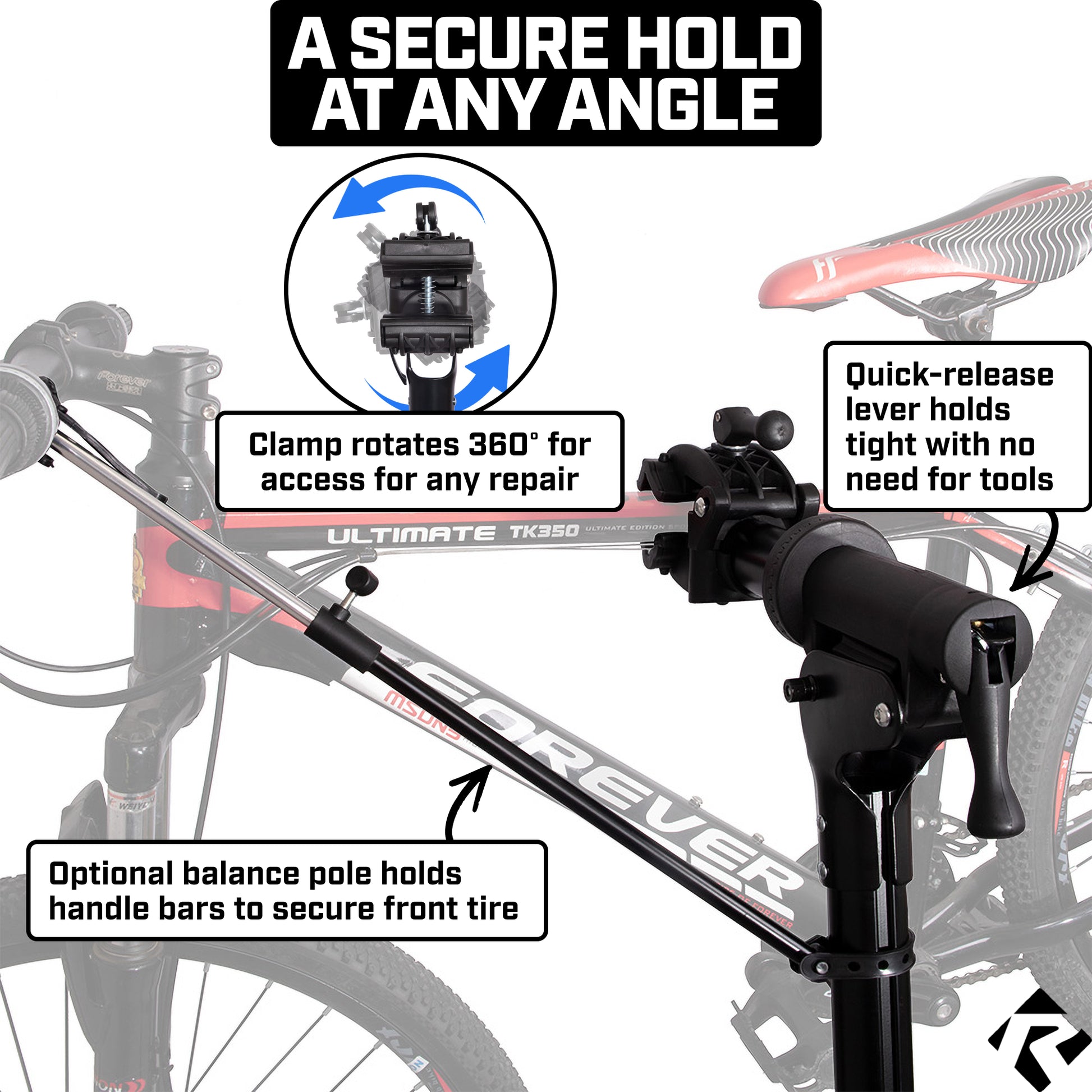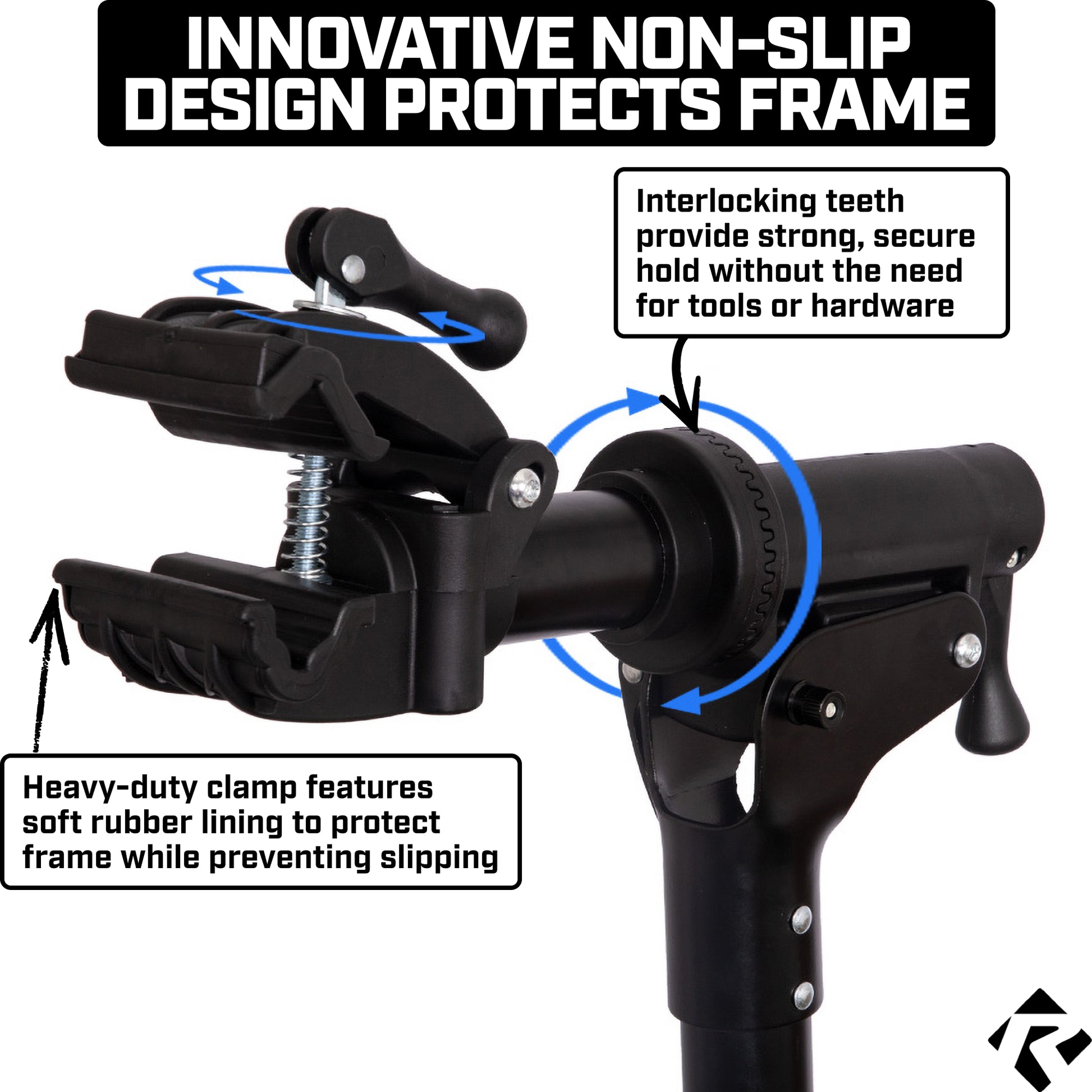 - Highly Adjustable for Any Repair - Telescoping center pole adjusts up to 30” so you can raise or lower your bike to just the right height. The bike clamp and clamp arm both rotate a full 360 degrees to clamp to your top, bottom, or seat tube and hold your bike at any angle. And an adjustable handlebar rod stabilizes your front wheel while you work. Clamp fits standard frames with 1" to 1.5" tubing.